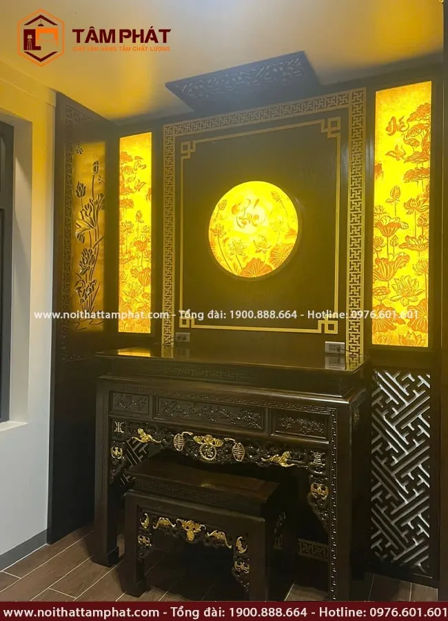 Phòng thờ nhà phố mẫu BT-1211 toát lên vẻ đẹp hiện đại và sang trọng. Điểm nhấn đầu tiên là hệ thống vách ngăn CNC ba mặt với họa tiết hoa sen mềm mại, tạo sự kín đáo riêng tư nhưng không bị bí bách. Vách gỗ ốp tường được trang trí thêm tranh trúc chỉ. Ở giữa là bức tranh tròn hình hoa sen tỏa sáng, hai bên là tranh trúc chỉ chữ nhật, kết hợp với đường phào chỉ sát vàng, mang đến cảm giác ấm cúng và sang trọng cho không gian thờ.