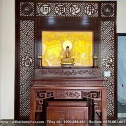 Phòng thờ được thiết kế phần ốp hậu gỗ. Hai bên là hệ vách ngăn CNC họa tiết chữ Vạn đối xứng. Phía trên là họa tiết CNC hình bông sen, đi kèm với chữ A Di Đà Phật (quý khách có thể lựa chọn chữ tiếng Việt hoặc chữ Hán tùy theo yêu cầu).
